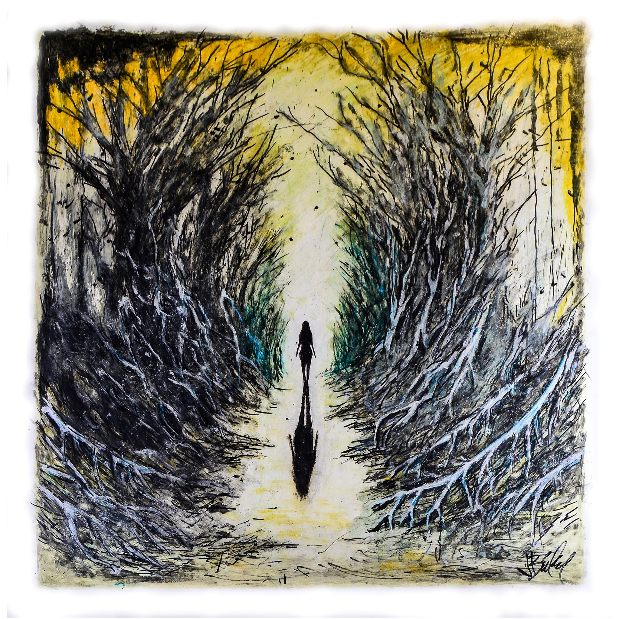 A solitary figure walks the thinning path, shadow stretching behind, as the woods close in and the light fades out...